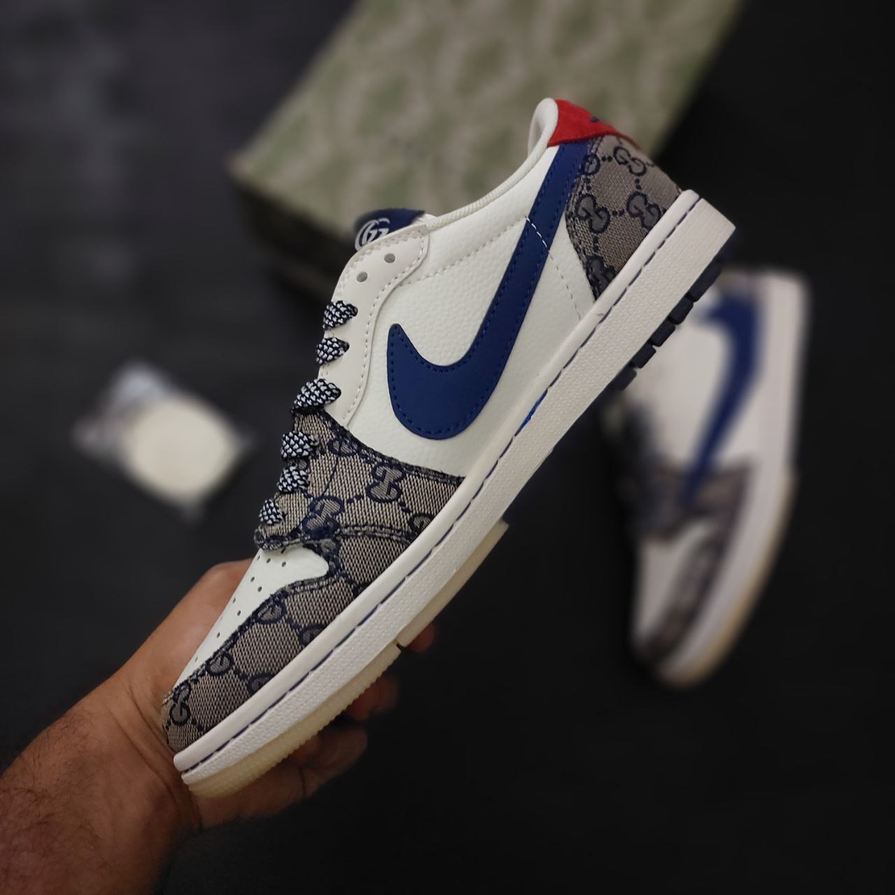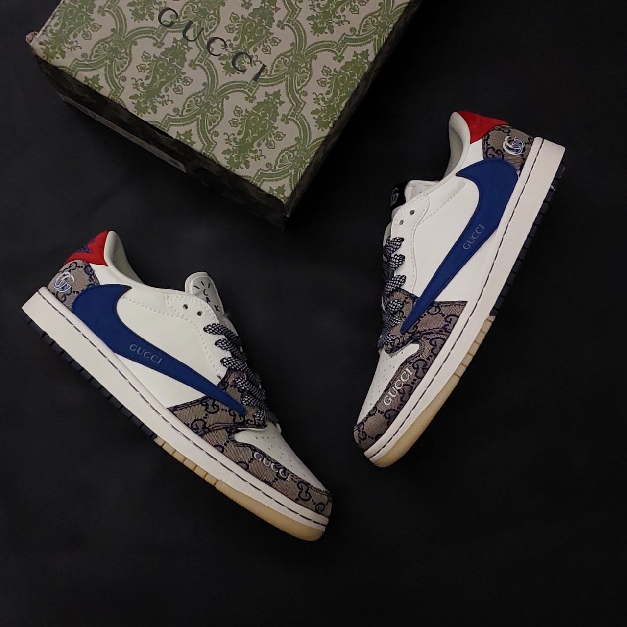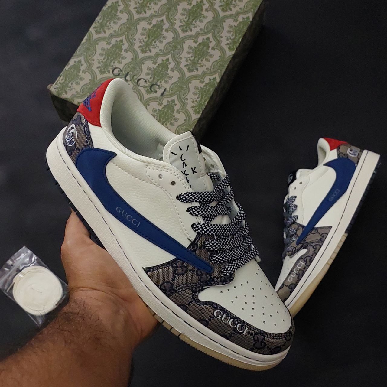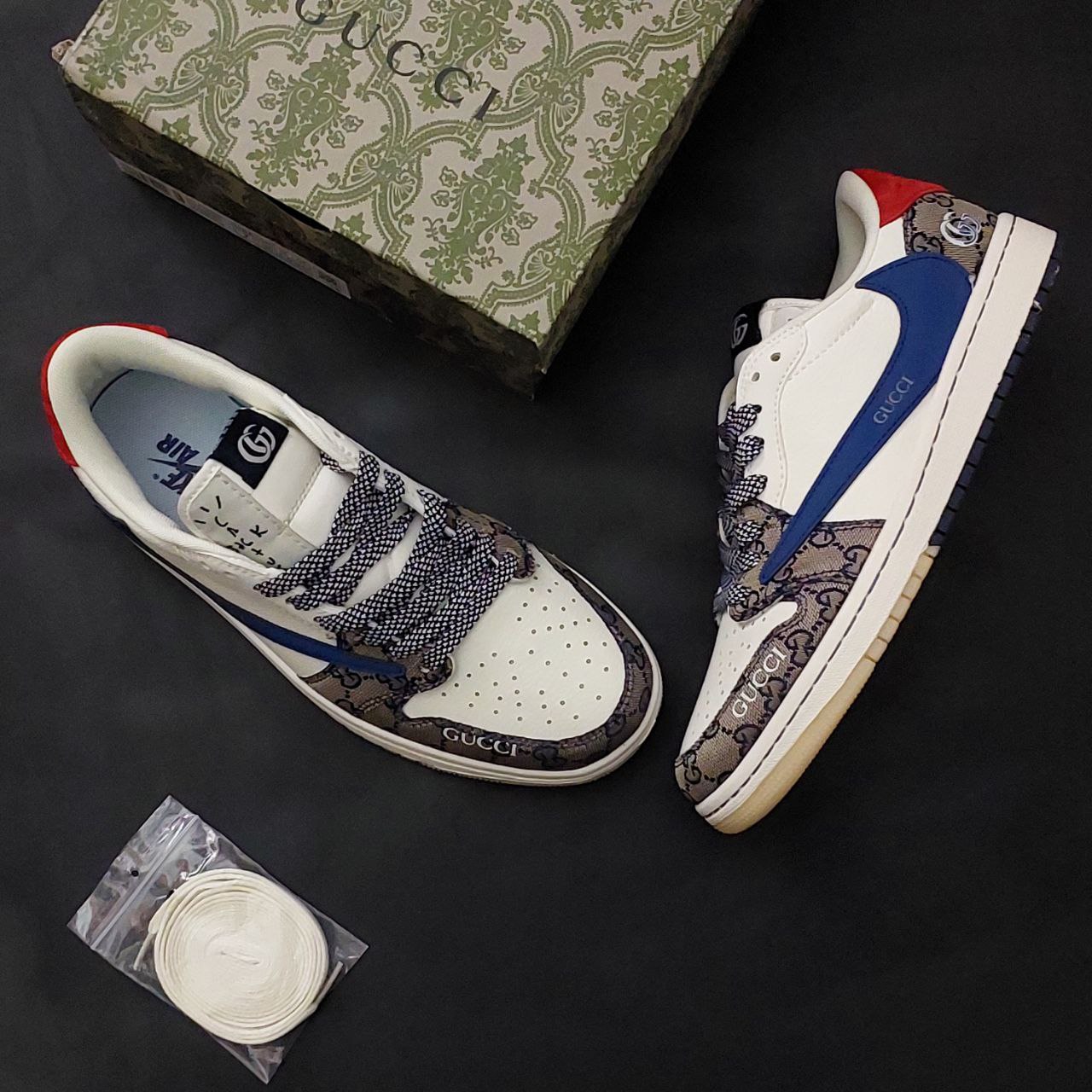 - طراحی منحصربهفرد: تلفیق المانهای طراحی نایک جردن با جزئیات گوچی و الهام از سبک تراویس اسکات، ظاهری خاص و چشمنواز ایجاد کرده است.