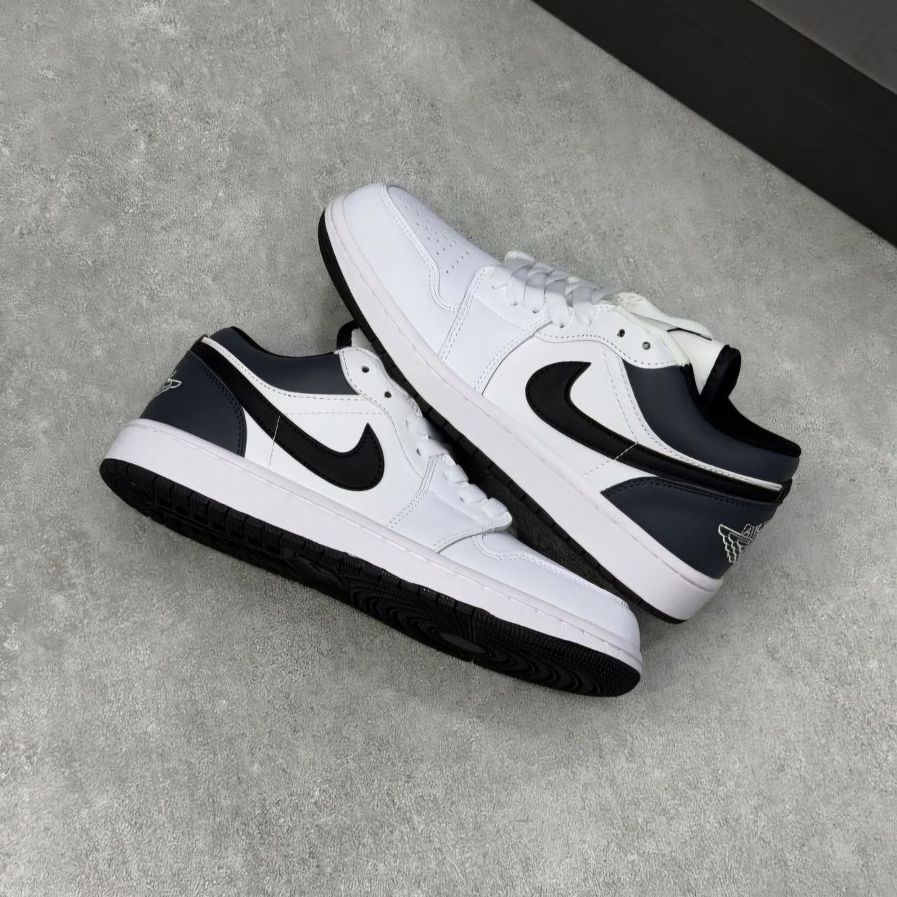 رنگ سفید همیشه نمادی از پاکیزگی، سادگی و مینیمالیسم بوده است. زمانی که با رنگ سرمه‌ای ترکیب می‌شود، ظاهری رسمی‌تر و جدی‌تر به خود می‌گیرد. کفش اسپرت نایک ایر جردن وان بدون ساق سفید سرمه‌ای مردانه با استفاده هوشمندانه از این دو رنگ، تعادل جذابی ایجاد کرده است. رنگ سفید به‌عنوان پایه کفش باعث روشنایی و جلوه بیشتر آن می‌شود، در حالی که جزئیات سرمه‌ای باعث تقویت ظاهر اسپرت و مدرن کفش شده‌اند.