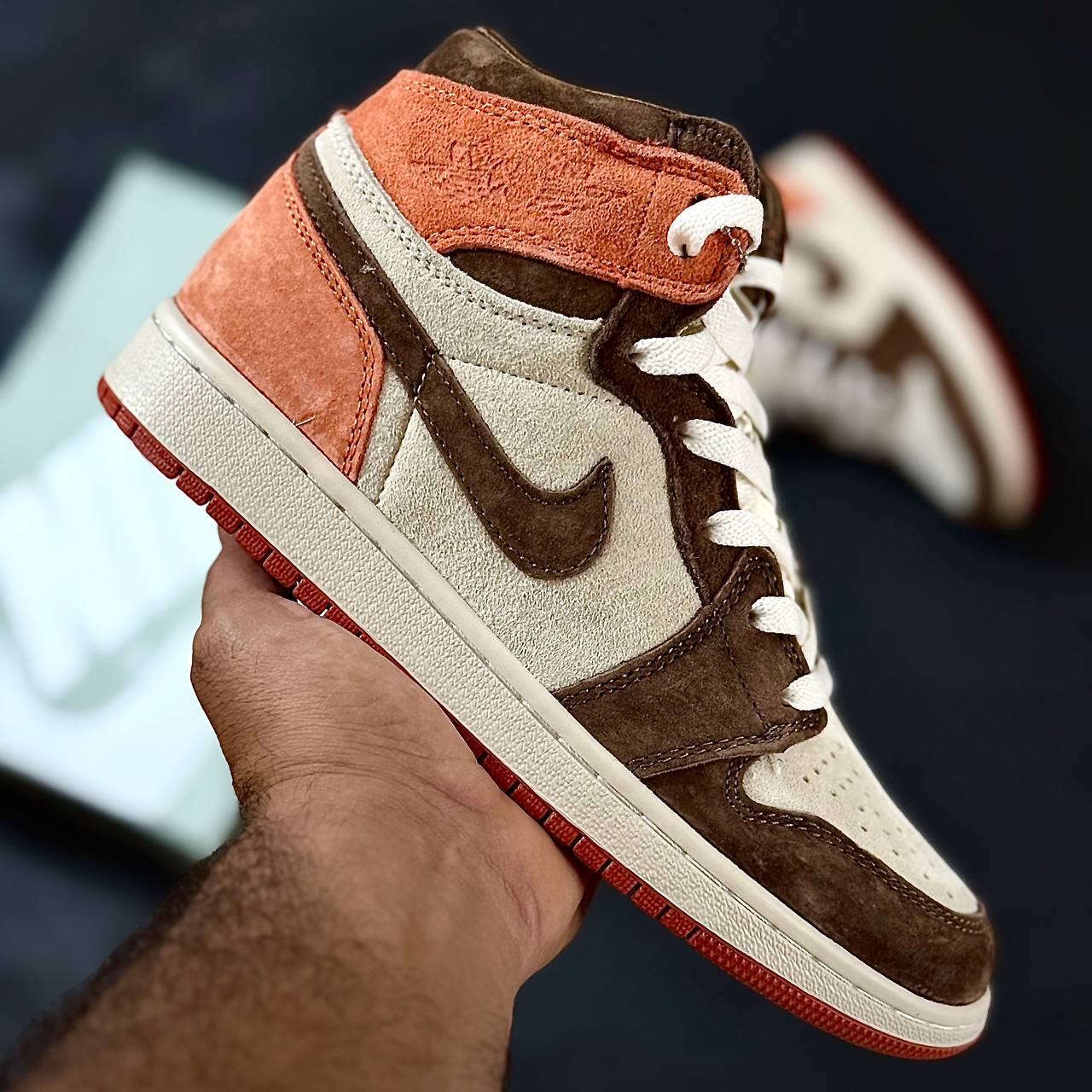 این کفش با الهام از طراحی اصلی Air Jordan 1 ساخته شده است، اما با ترکیب رنگ مدرن و جذاب سفید، قهوه ای و نارنجی ظاهر متفاوت و چشمگیرتری پیدا کرده است. کفش نایک جردن وان مردانه مدل داستد کلی سفید قهوه ای نارنجی برای آقایانی طراحی شده که بهدنبال کفشی بادوام، شیک و مناسب استفاده روزمره هستند. کیفیت ساخت آن ویتنامی درجه یک است، یعنی از متریال مقاوم، رویه مستحکم، دوخت قوی و زیره باکیفیت تشکیل شده و ماندگاری فوقالعادهای دارد.